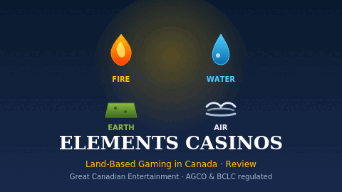 Elements Casino is a network of land-based gaming venues operated by Great Canadian Entertainment, one of Canada's largest casino operators. It is not an online casino — despite what some copycat websites using the Elements name suggest — and never has been. This review covers what Elements actually is: a chain of AGCO-regulated (Ontario) and BCLC-regulated (British Columbia) physical casinos, currently undergoing a major ownership transition in BC as Great Canadian transfers properties to First Nations communities.