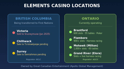 Practical takeaway for players: all three BC Elements properties are currently open under Great Canadian management. Once sales close, branding may change over time as First Nations owners develop their operations. Gaming experience, AGCO/BCLC regulation and GameSense responsible gambling programs don't change during ownership transitions.