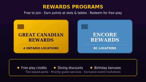 What are the Elements Casino loyalty programs? Great Canadian Rewards for Ontario locations (plus other Great Canadian Ontario properties) and Encore Rewards for British Columbia locations. Both are free to join, earn points on slots and table games, and redeem for free play, dining comps and other perks.