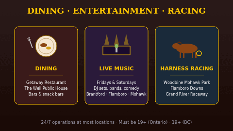 Elements Casino is a solid, legitimate, regulated network of Canadian land-based casinos. The Ontario properties (Brantford, Flamboro, Mohawk, Grand River) are established, fully operational and offer a genuine entertainment package — gaming floor plus dining plus live music plus harness racing. They're AGCO-regulated with all the consumer protections that implies.
