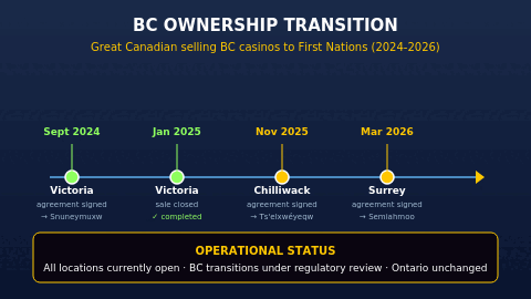 Starting in September 2024, Great Canadian began announcing a series of agreements to sell BC properties to First Nations-controlled development corporations. By early 2026, eight BC casinos have been sold or agreed to be sold. The Elements BC properties specifically: