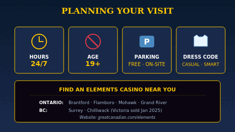 The single most important thing this review can tell you: the real Elements Casino is a chain of brick-and-mortar destinations you physically visit. If you see an "Elements Casino online" site offering you a welcome bonus, that is not Great Canadian Entertainment. Do not give those sites your banking information. If you want to gamble online, use Ontario's iGaming registry or your provincial lottery platform.