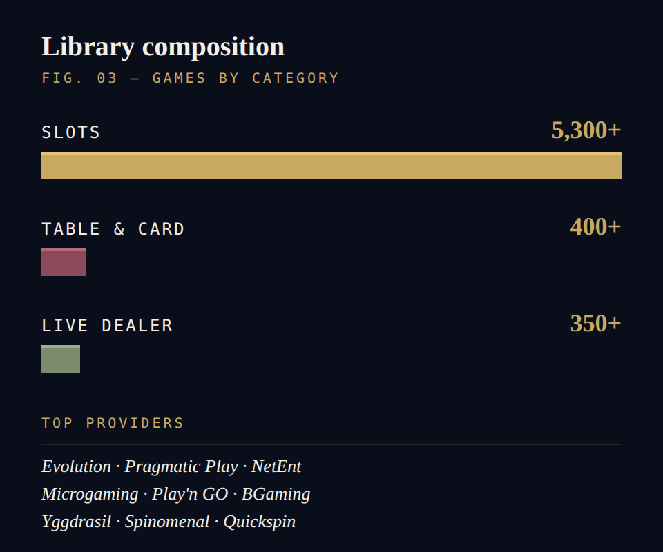 Library composition FIG. 03 — GAMES BY CATEGORY SLOTS 5,300+ TABLE & CARD GAMES 400+ LIVE DEALER 350+ PROVIDERS — Evolution · Pragmatic Play · NetEnt · Microgaming · Play'n GO · BGaming · Yggdrasil · Spinomenal