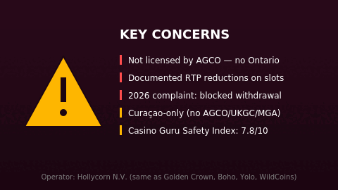 Important upfront: SkyCrown operates on a Curaçao license only. It is not registered with the Alcohol and Gaming Commission of Ontario or iGaming Ontario, and it does not appear in the iGO operator registry. That matters for Ontario players. More importantly, multiple independent sources have flagged two specific issues worth knowing before you deposit: documented RTP reductions on slot titles and a fresh 2026 complaint about a blocked Canadian withdrawal. Both are covered below.
