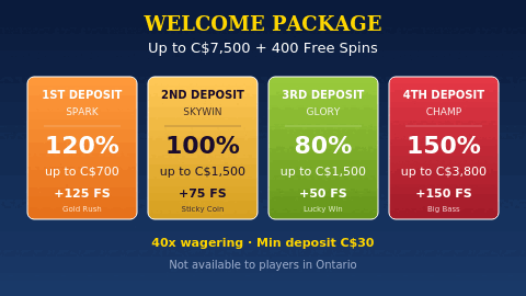 What welcome bonus does SkyCrown offer? Up to C$7,500 + 400 free spins across four deposits. First deposit: 120% up to C$700 + 125 FS (code SPARK). Second: 100% up to C$1,500 + 75 FS (SKYWIN). Third: 80% up to C$1,500 + 50 FS (GLORY). Fourth: 150% up to C$3,800 + 150 FS (CHAMP). Wagering is 40x, minimum deposit C$30. Not available in Ontario.