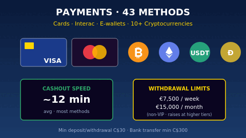 - 43 payment methods including Interac and 10+ cryptocurrencies