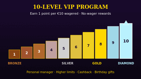 SkyCrown runs a 10-level VIP program. Players earn 1 loyalty point per €10 wagered (roughly C$15 per point at current rates). Tiers progress from entry-level through Bronze, Silver, Gold and up to Diamond/Inner Circle.